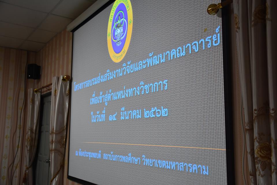 ณ ห้องประชุมพลบดี สถาบันการพลศึกษา วิทยาเขตมหาสารคาม ฝ่ายวิจัยและประกันคุณภาพการศึกษา สถาบันการพลศึกษา วิทยาเขตมหาสารคาม จัดโครงการอบรมส่งเสริมงานวิจัยและพัฒนาคณาจารย์เพื่อเข้าสู่ตำแหน่งทางวิชาการ โดยมี นายกอบกิจ ธรรมานุชิต รองอธิการบดีสถาบันการพลศึกษา ประจำวิทยาเขตมหาสารคาม เป็นประธานเปิดโครงการ โดยโครงการนี้ จัดขึ้น เพื่อส่งเสริมงานวิจัยให้คณาจารย์ให้เข้าใจและส่งเสริมการทำงานวิจัยให้เข้ากับตำแหน่งทางวิชาการ เป็นการสร้างความเข้าใจให้กับคณาจารย์เกี่ยวกับหลักเกณฑ์ วิธีการ ในการเสนอขอกำหนดตำแหน่งทางวิชาการและการสร้างผลงานทางวิชาการให้สอดคล้องและเป็นไปตามประกาศ ก.พ.อ. และข้อบังคับของสถาบันฯ รับทราบแนวทางและเทคนิคการจัดทำผลงานทางวิชาการในเบื้องต้นจากวิทยากรที่มากด้วยประสบการณ์ ให้ผู้เข้าร่วมโครงการ ได้มีโอกาสแลกเปลี่ยนความรู้ ประสบการณ์ ข้อคิดเห็น ปัญหา อุปสรรคต่าง ๆ ในการเสนอขอกำหนดตำแหน่งทางวิชาการ รวมถึงวิธีการแก้ไขและร่วมหารือแนวทางที่เป็นประโยชน์ต่อบุคลากรของสถาบันการพลศึกษามหาสารคาม ในโครงการดังกล่าวได้รับเกียรติจาก ศ.ดร.วิเชียร มากตุ่น และ นายไพศาล สังข์ฉ่ำ ที่ให้เกียรติมาเป็นวิทยากรบรรยายให้ความรู้ในครั้งนี้
