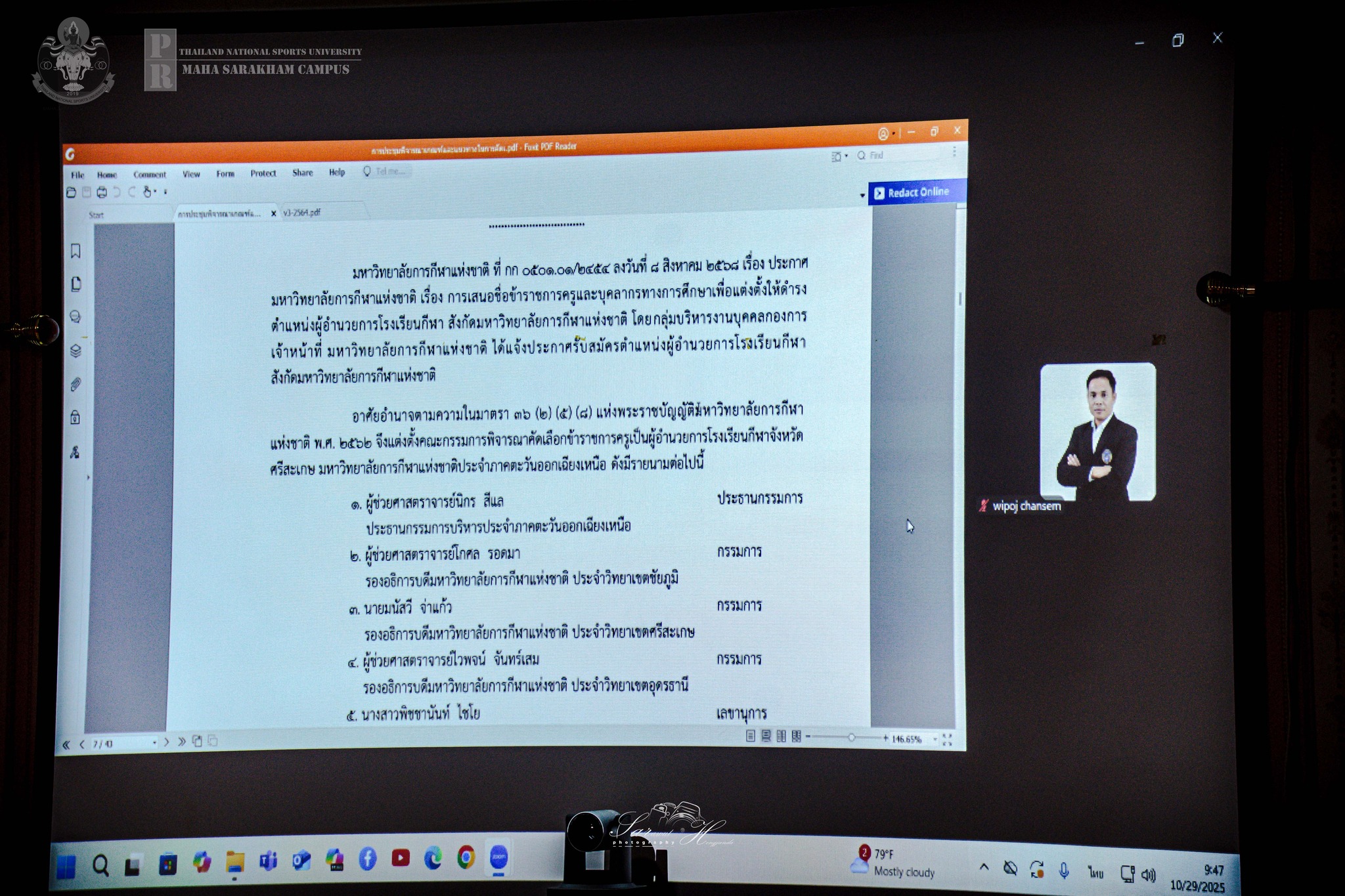 เมื่อวันที่ 29 ตุลาคม 2568 ณ ห้องประชุมพลบดี ชั้น 2 อาคารสำนักงานรองอธิการบดี มหาวิทยาลัยการกีฬาแห่งชาติ วิทยาเขตมหาสารคาม ผศ.ดร.นิกร สีแล รองอธิการบดีมหาวิทยาลัยการกีฬาแห่งชาติ ประจำวิทยาเขตมหาสารคาม ประธานกรรมการบริหารประจำภาคตะวันออกเฉียงเหนือ เป็นประธานการประชุม เพื่อพิจารณาหลักเกณฑ์และแนวทางในการคัดเลือกผู้อำนวยการโรงเรียนกีฬา จังหวัดศรีสะเกษ ด้วยสำนักงานคณะกรรมการบริหารประจำภาคตะวันออกเฉียงเหนือ ได้กำหนดจัดประชุมขึ้น ทั้งนี้ ตามที่ มหาวิทยาลัยการกีฬาแห่งชาติ ได้ประกาศ เรื่องการเสนอชื่อข้าราชการครูและบุคลากรทางการศึกษาเพื่อแต่งตั้งให้ดำรง ตำแหน่งผู้อำนวยการโรงเรียนกีฬา สังกัดมหาวิทยาลัยการกีฬาแห่งชาติ เมื่อวันที่ 8 สิงหาคม 2568 ที่ผ่านมา ทั้งนี้ อาศัยอำนาจตามความในมาตรา 36 แห่งพระราชบัญญัติมหาวิทยาลัยการกีฬาแห่งชาติ พ.ศ.2562 จึงแต่งตั้งคณะกรรมการพิจารณาคัดเลือกข้าราชการครูเป็นผู้อำนวยการโรงเรียนกีฬา จังหวัดศรีสะเกษ มหาวิทยาลัยการกีฬาแห่งชาติ ประจำภาคตะวันออกเฉียงเหนือ โดยมี ผศ.ดร.นิกร สีแล ประธานกรรมการบริหารประจำภาคตะวันออกเฉียงเหนือ เป็นประธานคณะกรรมการพิจารณาคัดเลือก พร้อมด้วย ผศ.โกศล รอดมา รองอธิการบดีมหาวิทยาลัยการกีฬาแห่งชาติ ประจำวิทยาเขตชัยภูมิ นายมนัสวี จ่าแก้ว รองอธิการบดีมหาวิทยาลัยการกีฬาแห่งชาติ ประจำวิทยาเขตศรีสะเกษ ผศ.ไวพจน์ จันทร์เสม รองอธิการบดีมหาวิทยาลัยการกีฬาแห่งชาติ ประจำวิทยาเขตอุดรธานี เป็นกรรมการ และ นางสาว พิชชานันท์ ไชโย เลขานุการ