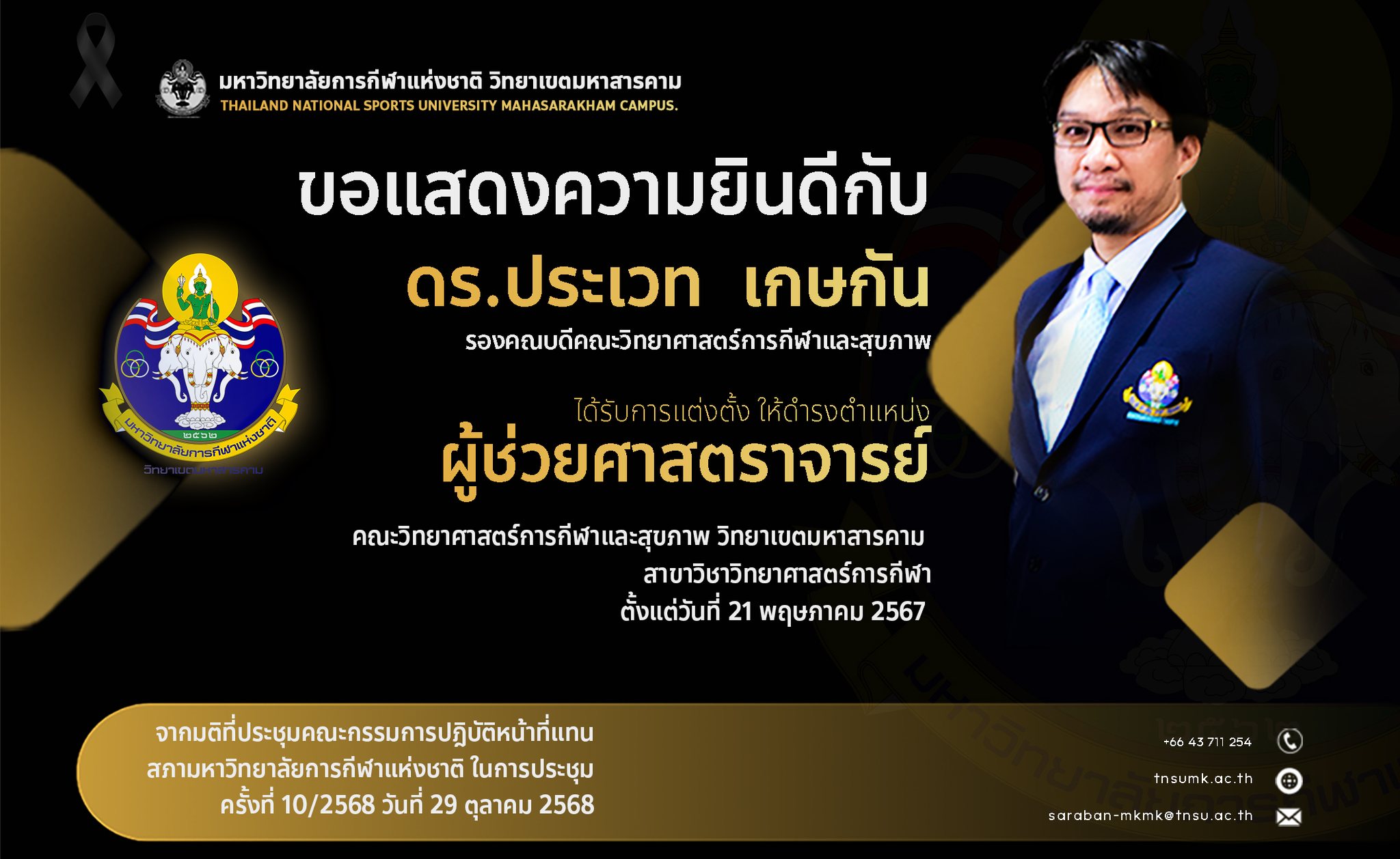 ขอแสดงความยินดีกับ ดร.ประเวท เกษกัน ได้รับการแต่งตั้งตำแหน่ง ผู้ช่วยศาสตราจารย์ สาขาวิชาวิทยาศาสตร์การกีฬา