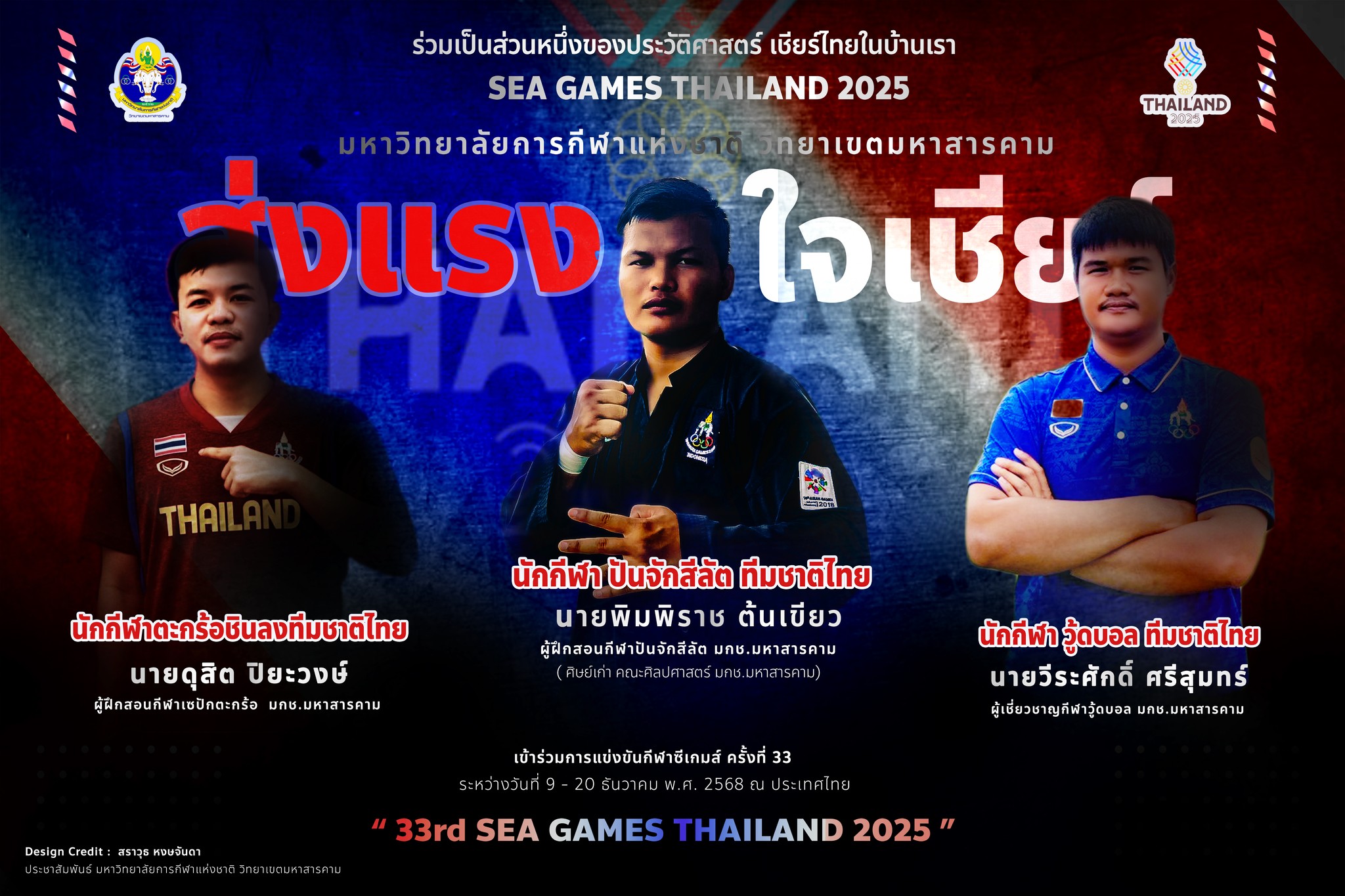 ร่วมเชียร์และส่งพลังใจให้บุคลากรในสังกัด ที่ได้รับคัดเลือกเป็นนักกีฬาทีมชาติไทย ลงแข่งขันมหกรรมกีฬาซีเกมส์ 2025 ครั้งที่ 33 ซึ่งประเทศไทยเป็นเจ้าภาพ ระหว่างวันที่ 9–20 ธันวาคม 2568 ในปีนี้ มหาวิทยาลัยการกีฬาแห่งชาติ วิทยาเขตมหาสารคาม มีบุคลากรคุณภาพจำนวน 3 คน ผ่านการคัดเลือกสู่ระดับทีมชาติไทย ได้แก่