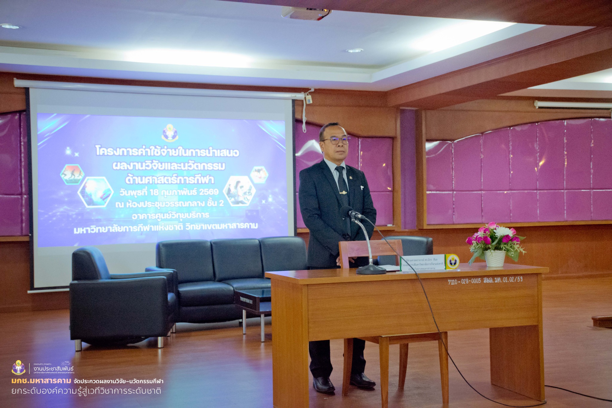 เมื่อวันที่ 18 กุมภาพันธ์ 2569 ณ ห้องประชุมวรรณกลาง มหาวิทยาลัยการกีฬาแห่งชาติ วิทยาเขตมหาสารคาม ได้จัดโครงการค่าใช้จ่ายในการนำเสนอผลงานวิจัยและนวัตกรรมด้านศาสตร์การกีฬาของอาจารย์และนักศึกษา ประจำปีงบประมาณ พ.ศ. 2569 โดยมี ผู้ช่วยศาสตราจารย์ ดร.นิกร สีแล รองอธิการบดีมหาวิทยาลัยการกีฬาแห่งชาติ ประจำวิทยาเขตมหาสารคาม เป็นประธานในพิธีเปิดโครงการอย่างเป็นทางการ