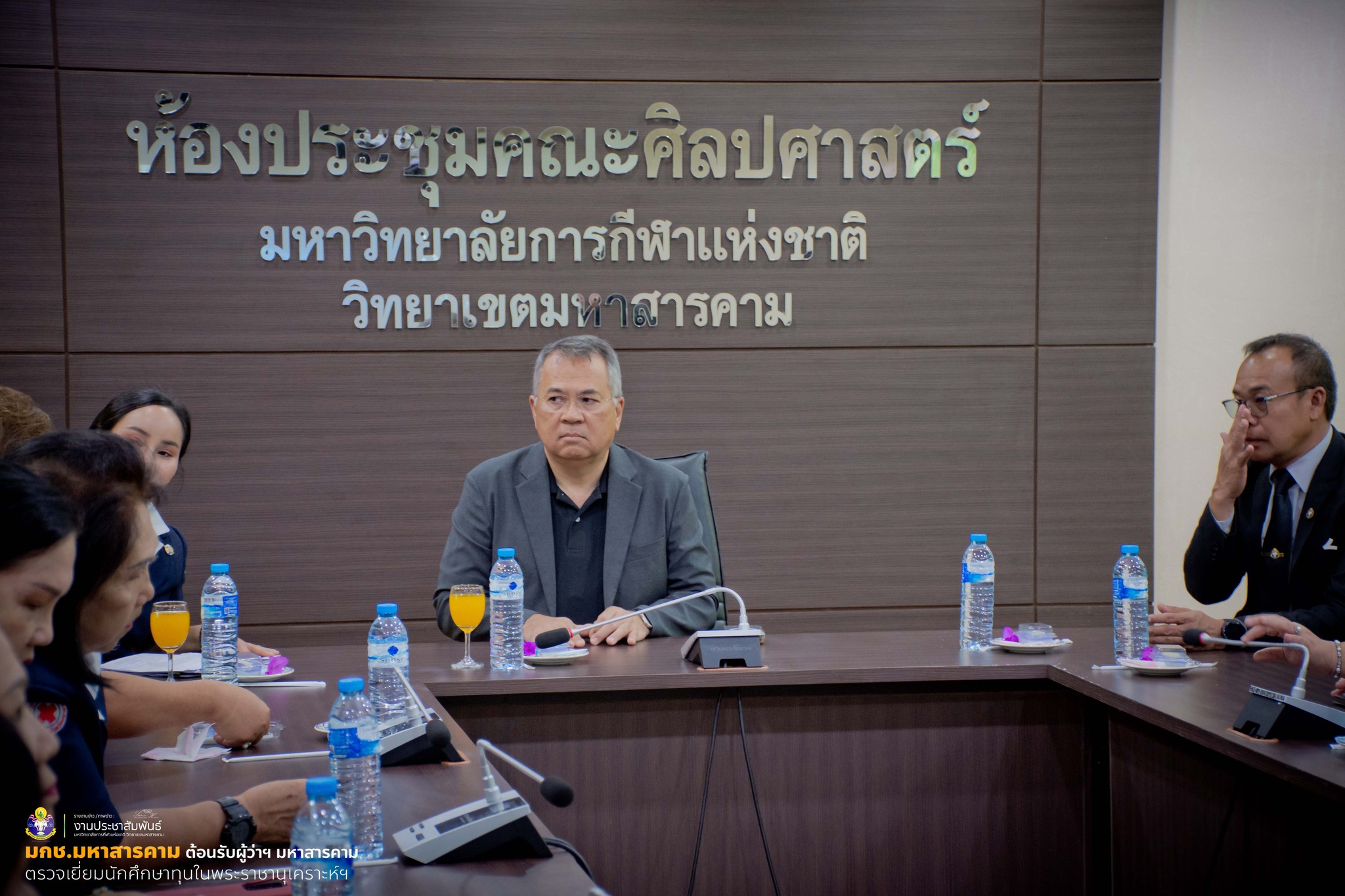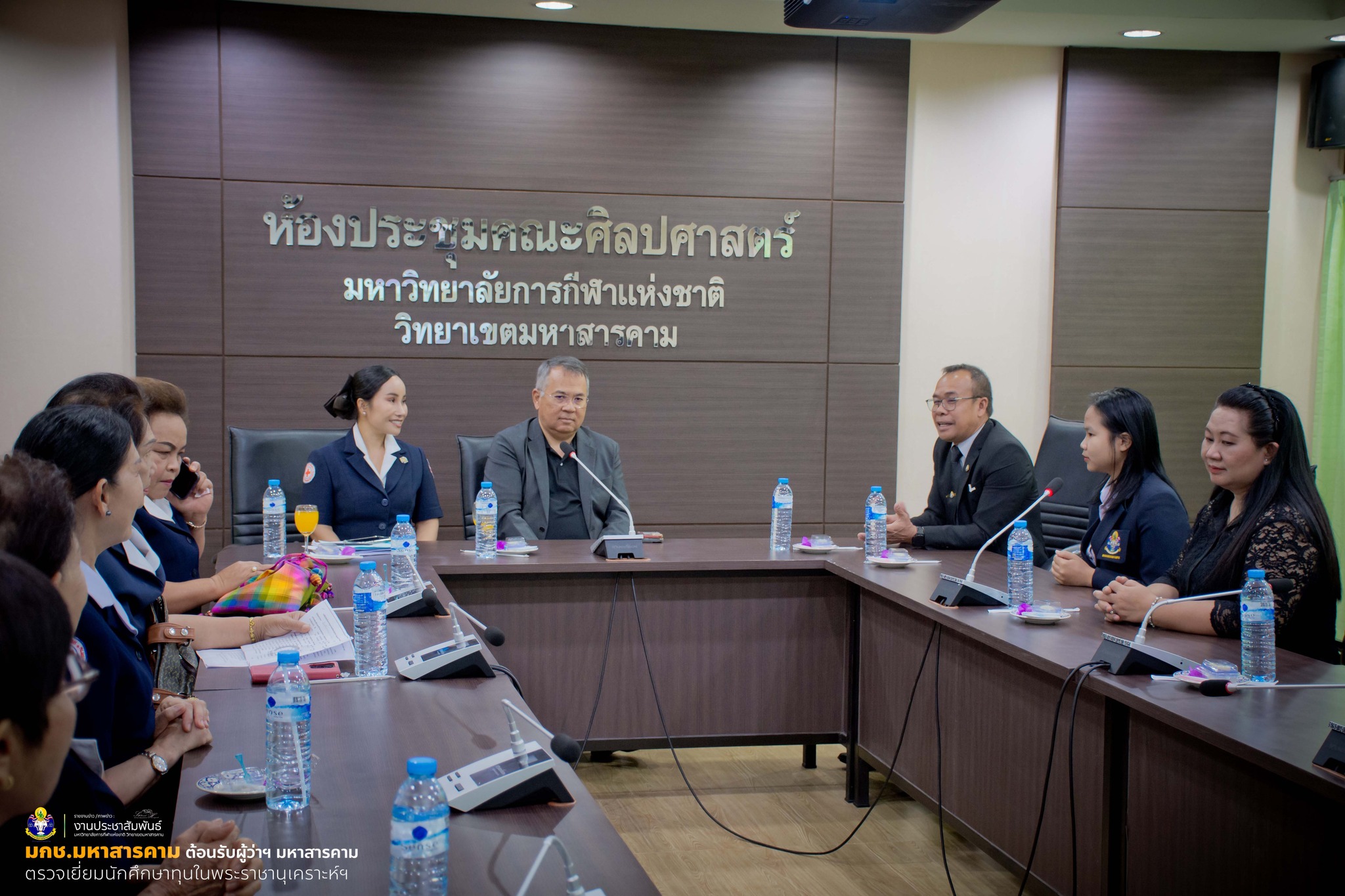 เมื่อวันที่ 18 กุมภาพันธ์ 2569 เวลา 09.30 น. ณ ห้องรองอธิการบดี ชั้น 2 อาคารศูนย์วิทยบริการ มหาวิทยาลัยการกีฬาแห่งชาติ วิทยาเขตมหาสารคาม ผู้ช่วยศาสตราจารย์ ดร.นิกร สีแล รองอธิการบดีมหาวิทยาลัยการกีฬาแห่งชาติ ประจำวิทยาเขตมหาสารคาม พร้อมด้วยคณะผู้บริหาร ให้การต้อนรับ นายชุมพิชญ์ เดชะรัฐ ผู้ว่าราชการจังหวัดมหาสารคาม พร้อมด้วย นางอุบล เดชะรัฐ นายกเหล่ากาชาดจังหวัดมหาสารคาม คณะกรรมการเหล่ากาชาดจังหวัดมหาสารคาม หัวหน้าส่วนราชการ และเจ้าหน้าที่ ในโอกาสลงพื้นที่ตรวจเยี่ยมนักศึกษาทุนตามโครงการ “เยี่ยมยาม ถามไถ่ ห่วงใยนักเรียนในพระราชานุเคราะห์ สมเด็จพระกนิษฐาธิราชเจ้า กรมสมเด็จพระเทพรัตนราชสุดาฯ สยามบรมราชกุมารี” ประจำปีการศึกษา พ.ศ. 2569 การลงพื้นที่ครั้งนี้มีเป้าหมายเพื่อติดตามความเป็นอยู่ด้านการศึกษา คุณภาพชีวิต และผลการเรียนของนักศึกษาผู้ได้รับพระราชทานทุน พร้อมสร้างขวัญกำลังใจให้มีความมุ่งมั่นตั้งใจศึกษาเล่าเรียน และพัฒนาตนเองเป็นกำลังสำคัญของประเทศในอนาคต