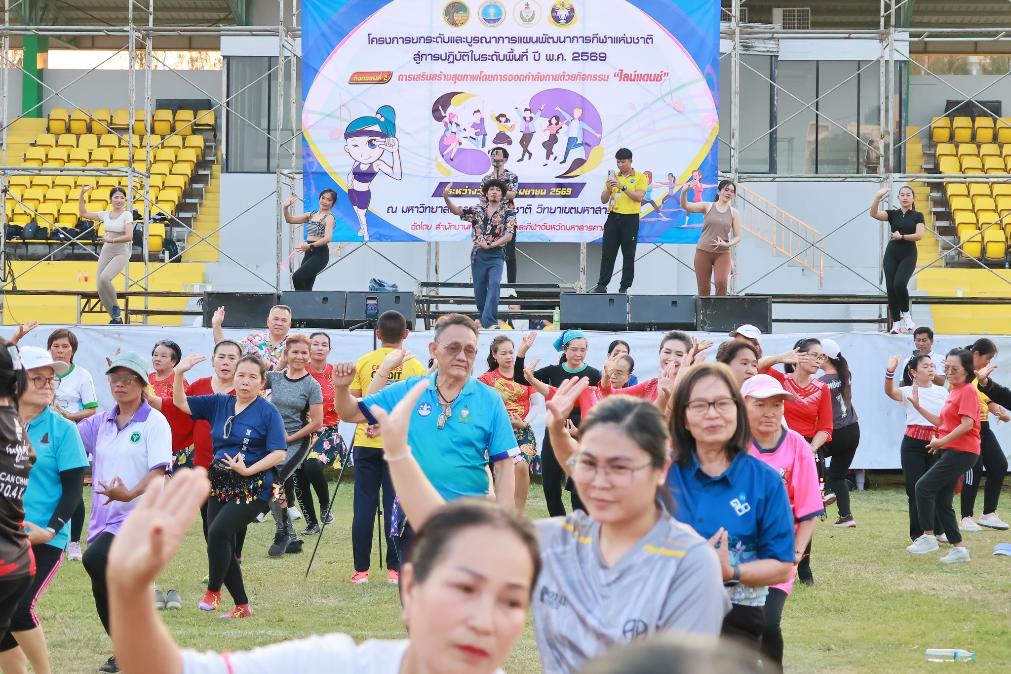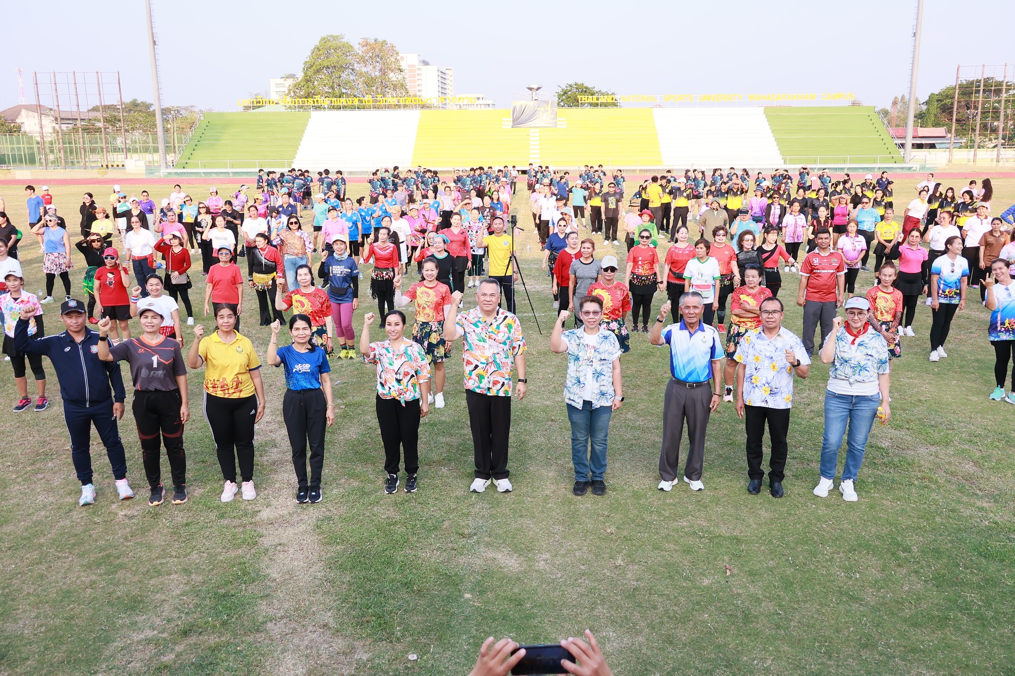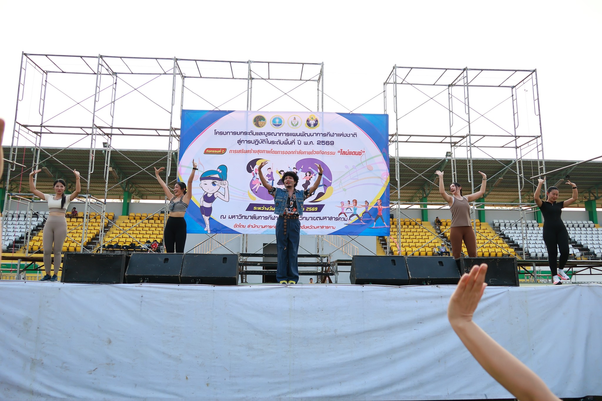 เมื่อวันที่ 3 เมษายน 2569 ณ สนามฟุตบอลปรีดารอดโพธิ์ทอง มหาวิทยาลัยการกีฬาแห่งชาติ วิทยาเขตมหาสารคาม ผู้ช่วยศาสตราจารย์ ดร.นิกร สีแล รองอธิการบดีประจำวิทยาเขตมหาสารคาม เข้าร่วมและให้การต้อนรับนายชุมพิชญ์ เดชะรัฐ ผู้ว่าราชการจังหวัดมหาสารคาม พร้อมด้วยนางอุบล เดชะรัฐ นายกเหล่ากาชาดจังหวัดมหาสารคาม นางสาวสาวิตรี กลิ่นหอม ท่องเที่ยวและกีฬาจังหวัดมหาสารคาม และเจ้าหน้าที่จากสำนักงานการท่องเที่ยวและกีฬาจังหวัดมหาสารคาม ตลอดจนหน่วยงานที่เกี่ยวข้อง ในโอกาสที่มหาวิทยาลัยการกีฬาแห่งชาติ วิทยาเขตมหาสารคาม ทำหน้าที่เป็นเจ้าภาพสถานที่ในการจัดโครงการ “ยกระดับและบูรณาการแผนพัฒนาการกีฬาแห่งชาติสู่การปฏิบัติในระดับพื้นที่” ผ่านกิจกรรมส่งเสริมสุขภาพด้วยการออกกำลังกายรูปแบบไลน์แดนซ์ ซึ่งจัดขึ้นโดยสำนักงานการท่องเที่ยวและกีฬาจังหวัดมหาสารคาม โดยมีผู้ว่าราชการจังหวัดมหาสารคามเป็นประธานในพิธีเปิด การจัดกิจกรรมในครั้งนี้มีวัตถุประสงค์เพื่อส่งเสริมให้เด็ก เยาวชน และประชาชนในจังหวัดมหาสารคาม ได้เข้าถึงการออกกำลังกายที่เหมาะสม สนุกสนาน และสามารถนำไปปรับใช้ในชีวิตประจำวันได้อย่างต่อเนื่อง อันจะนำไปสู่การมีสุขภาพที่ดีและคุณภาพชีวิตที่ยั่งยืน ทั้งนี้ ได้รับเกียรติจากอาจารย์มานพ แนวกลาง เป็นวิทยากรนำการออกกำลังกายด้วยกิจกรรมไลน์แดนซ์ สร้างความคึกคักและการมีส่วนร่วมจากผู้เข้าร่วมกิจกรรมเป็นอย่างมาก บรรยากาศภายในงานเป็นไปอย่างสนุกสนาน เป็นกันเอง และเต็มไปด้วยพลังแห่งการออกกำลังกาย สะท้อนถึงความร่วมมือของทุกภาคส่วนในการขับเคลื่อนนโยบายด้านการกีฬาและสุขภาพสู่ประชาชนอย่างเป็นรูปธรรม