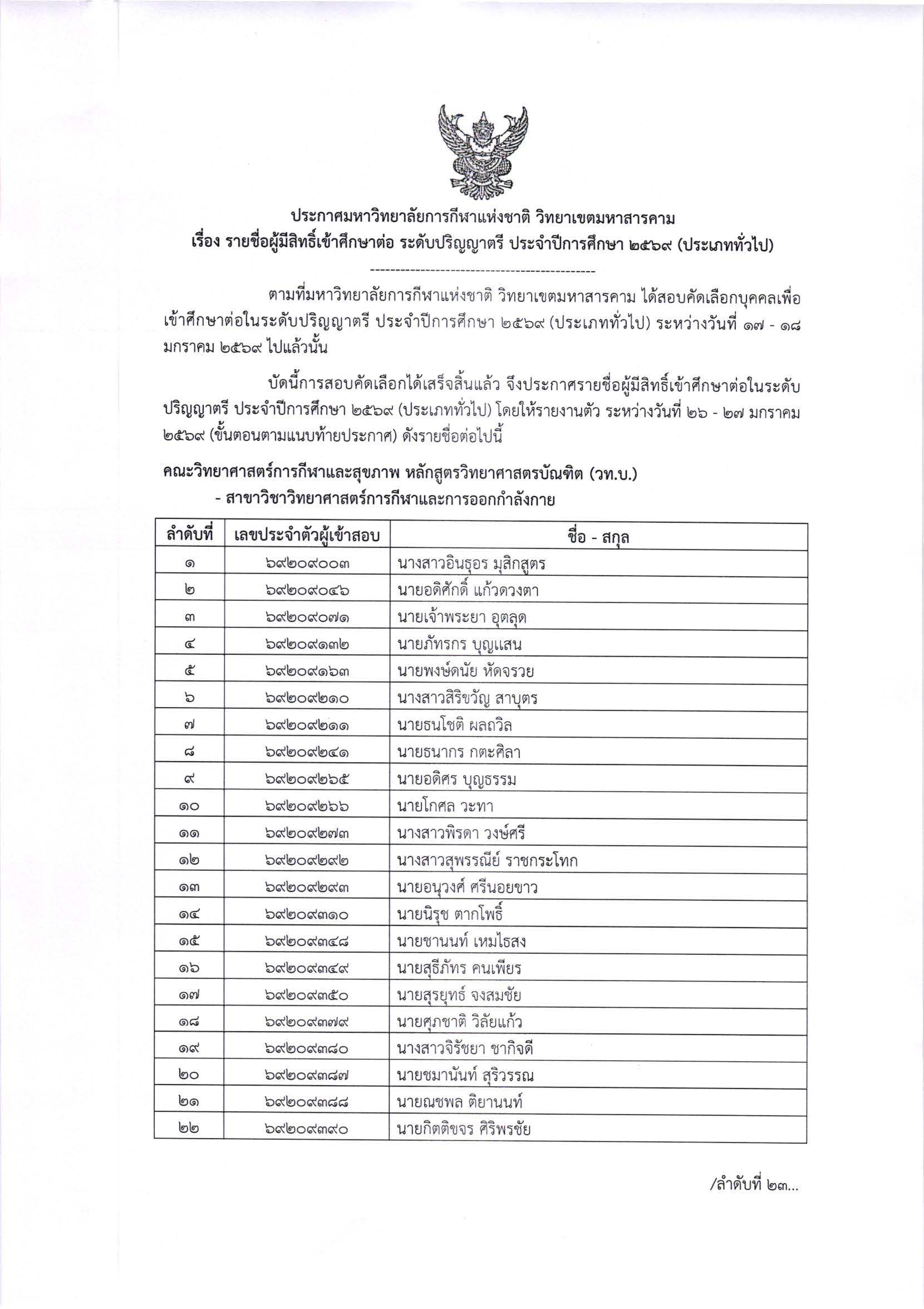 ประกาศ รายชื่อผู้มีสิทธิ์เข้าศึกษาต่อ ระดับปริญญาตรี ประจำปีการศึกษา 2569 (ประเภททั่วไป)